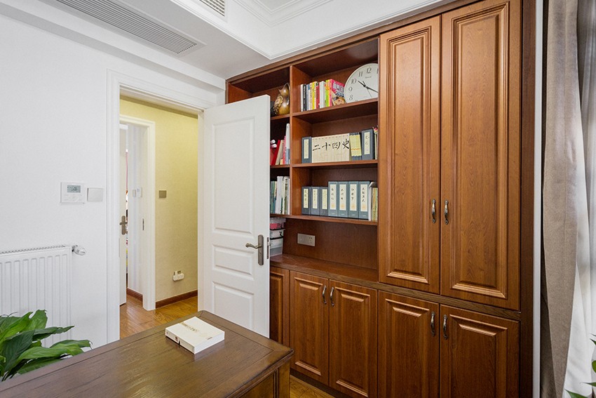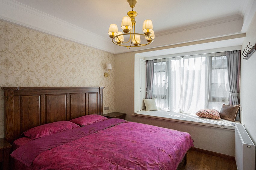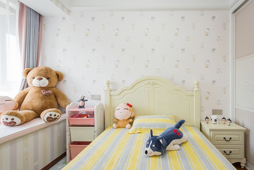 泊林春天裝修案例設(shè)計(jì)說明:以白色為基調(diào)營造的臥室空間盡顯干凈利落之感,床頭背景墻上簡約型石膏線條勾勒出精致的框架結(jié)構(gòu),左右兩側(cè)搭配簡美白色壁燈,中間區(qū)域與灰色布藝床背相搭看起來很協(xié)調(diào)。黑白相間的床頭柜+墻角的儲物柜+梳妝臺都是統(tǒng)一的款式,放在同一空間中與房間的格調(diào)很相符,襯托室內(nèi)簡潔利落之美。