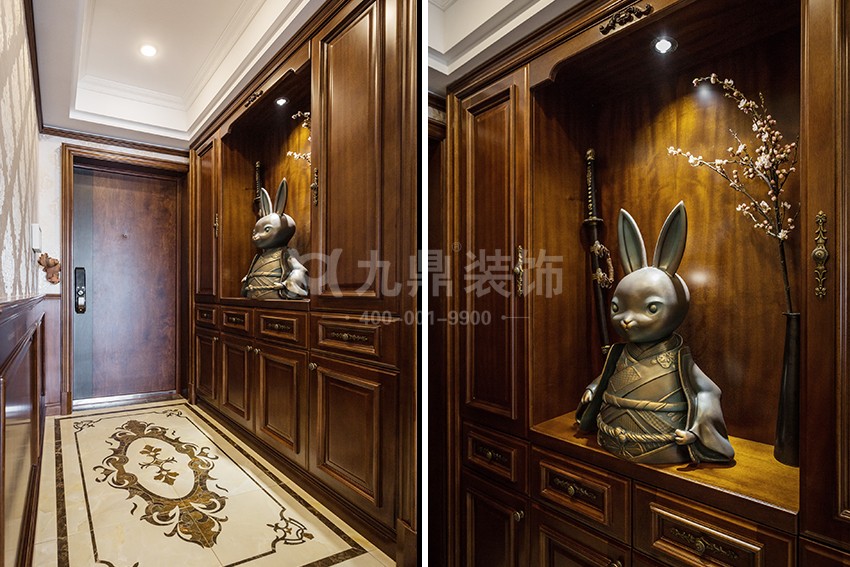 嘉里楓華居裝修案例設計說明:在造型設計的不是仿古,也不是復古而是追求神似。用簡化的手法、現代的材料和加工技術去追求傳統式樣的大致輪廓特點。注重裝飾效果,用室內陳設品來增強歷史文脈特色,往往會照搬古典設施、家具及陳設品來烘托室內環境氣氛。