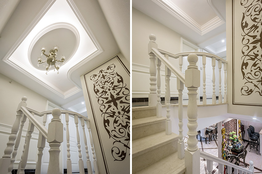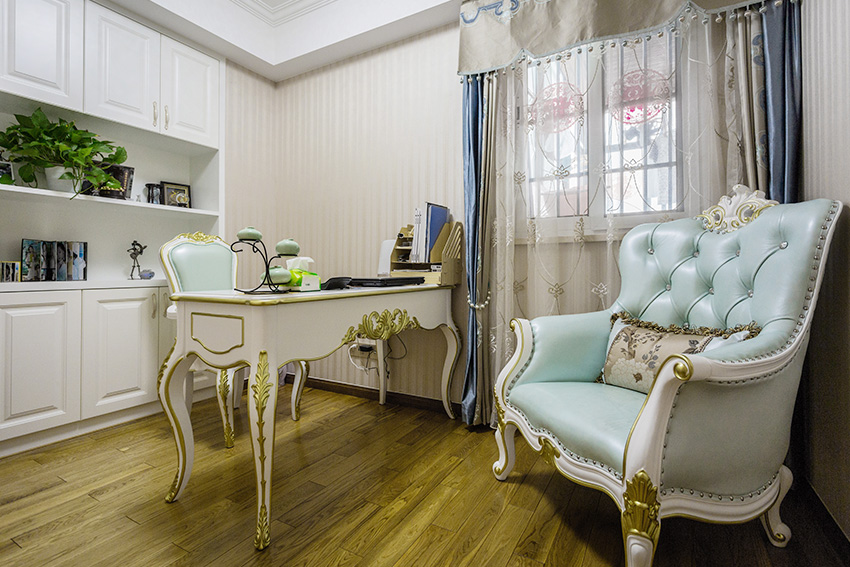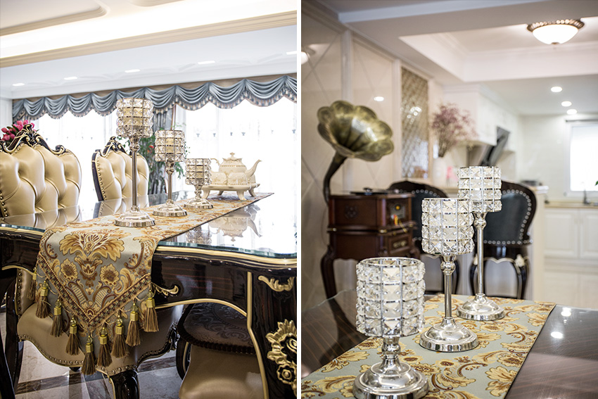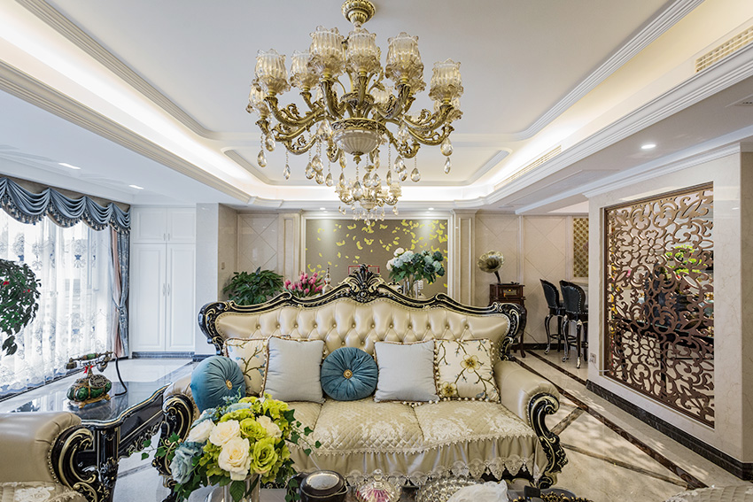 白色、金色、黃色、暗紅色是歐式風格中常見的主色調,少量白色糅合,使色彩看起來明亮。
