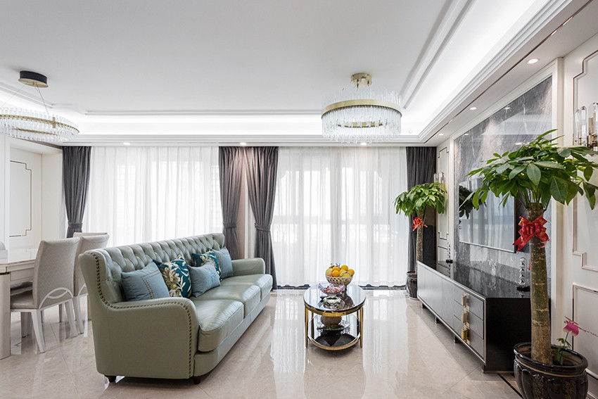 u土耳其灰大理石和白色調(diào)的搭配,皮質(zhì)沙發(fā),亮黑茶幾,緞面窗簾,濃濃的高級(jí)感和極致的輕奢相輔相成,精致低奢。