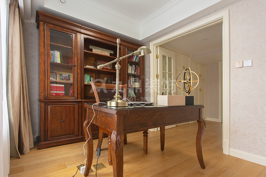 十二橡樹美筑裝修案例設計說明:美式風格對于懷舊古樸的東西比較偏愛,自然、懷舊、散發著質樸氣息的色彩是首選,美式風格搭配常常用仿古藝術品進行特顯文化藝術氣息,被翻卷邊的古舊書籍,動物的金屬雕像等等,這些東西搭配起來呈現出深邃的文化藝術氣息。