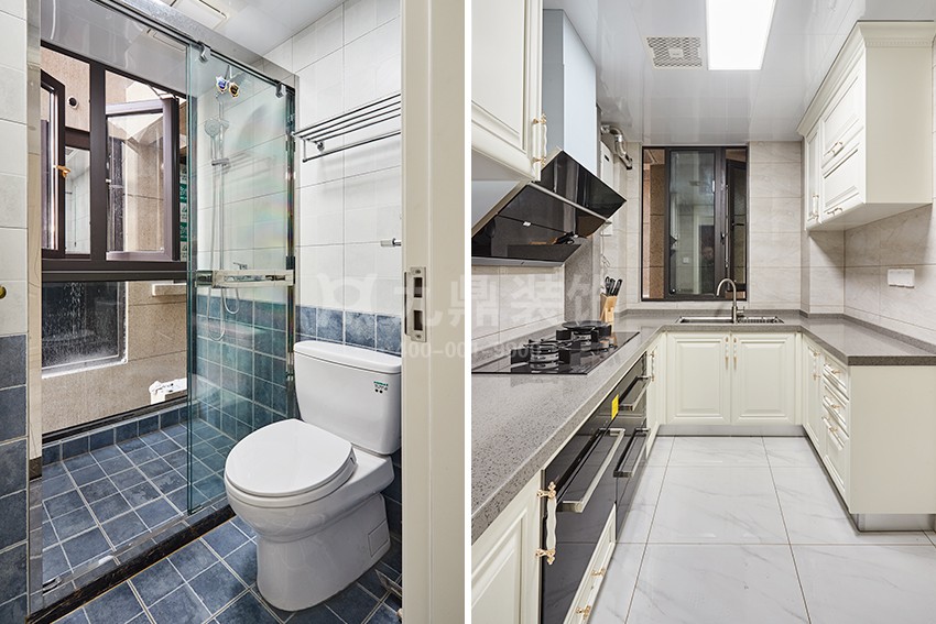 廚房:廚房空間整體使用淺色,象牙白色的櫥柜,淺色大理石紋地磚、墻磚,大面積的淺色運用減少空間緊迫感,讓空間更加明朗。