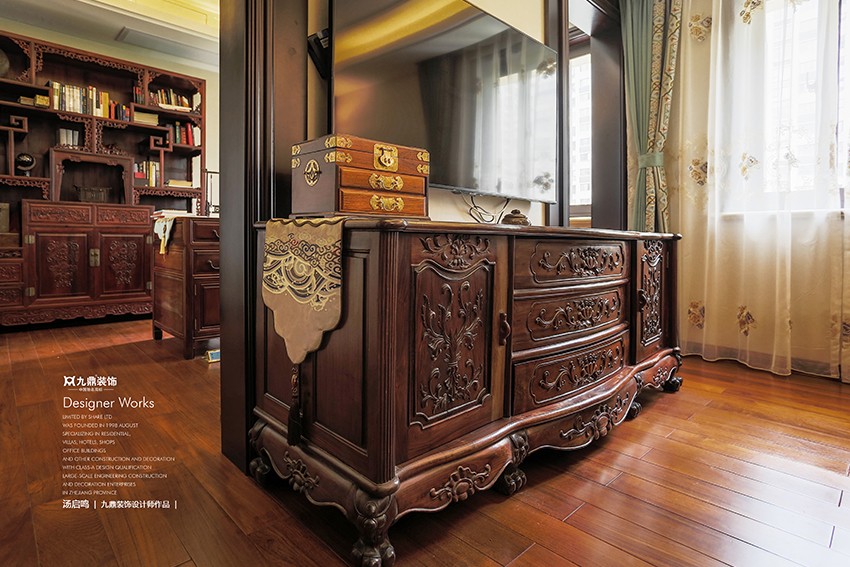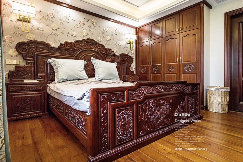 一副真絲刺繡的淡雅蓮花壁布闡述主人“出淤泥而不染,濯清漣而不妖”的品格,介入傳統家具和元素的點綴,詮釋中式氣質溫文爾雅的格調。
