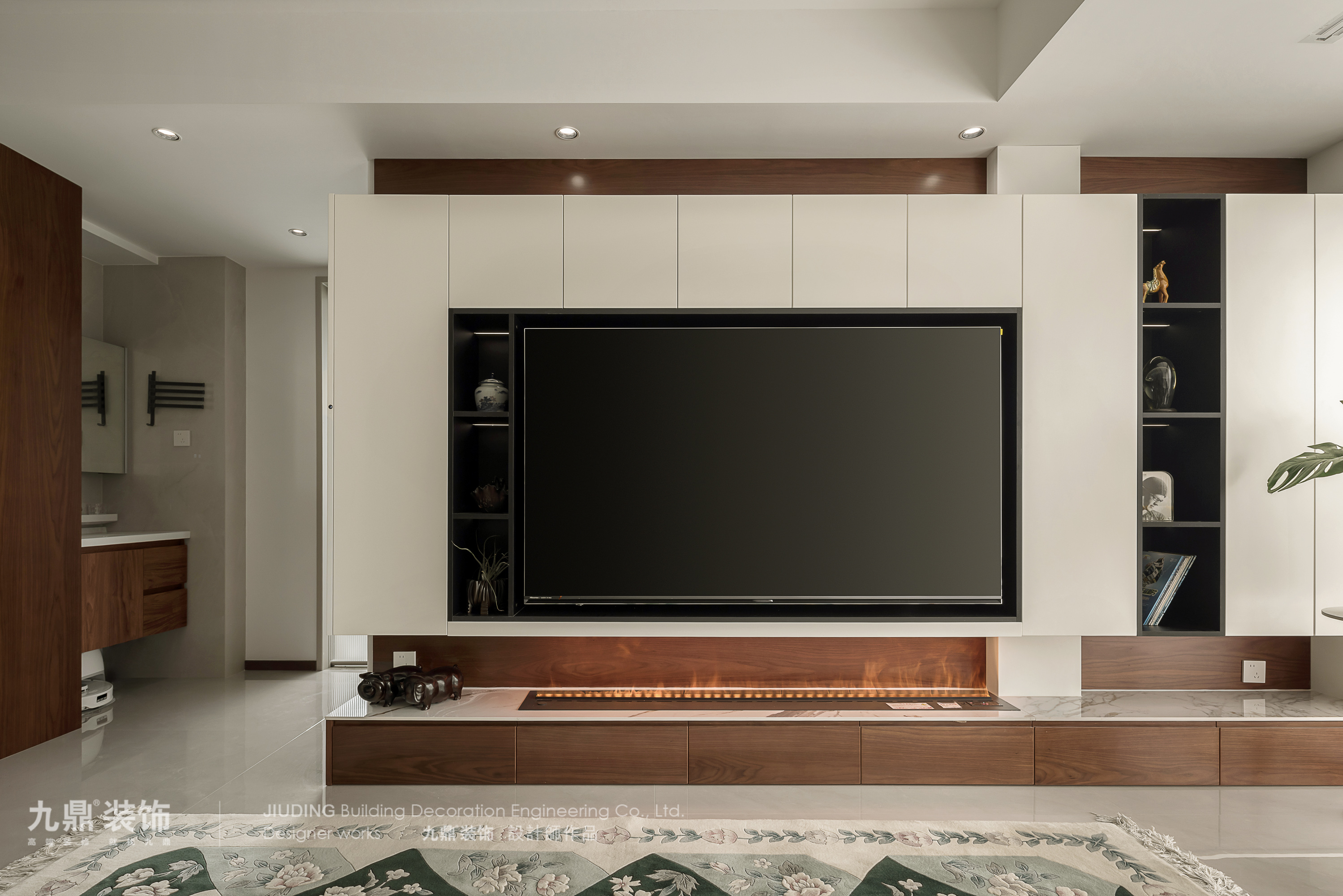 整墻電視收納柜: 取代傳統(tǒng)電視柜。采用“藏八露二”原則,80%柜門(mén)(無(wú)把手設(shè)計(jì)更簡(jiǎn)潔)隱藏雜物、藥品、工具箱;20%開(kāi)放格展示書(shū)籍、收藏品。電視嵌入其中,整體感極強(qiáng)。
